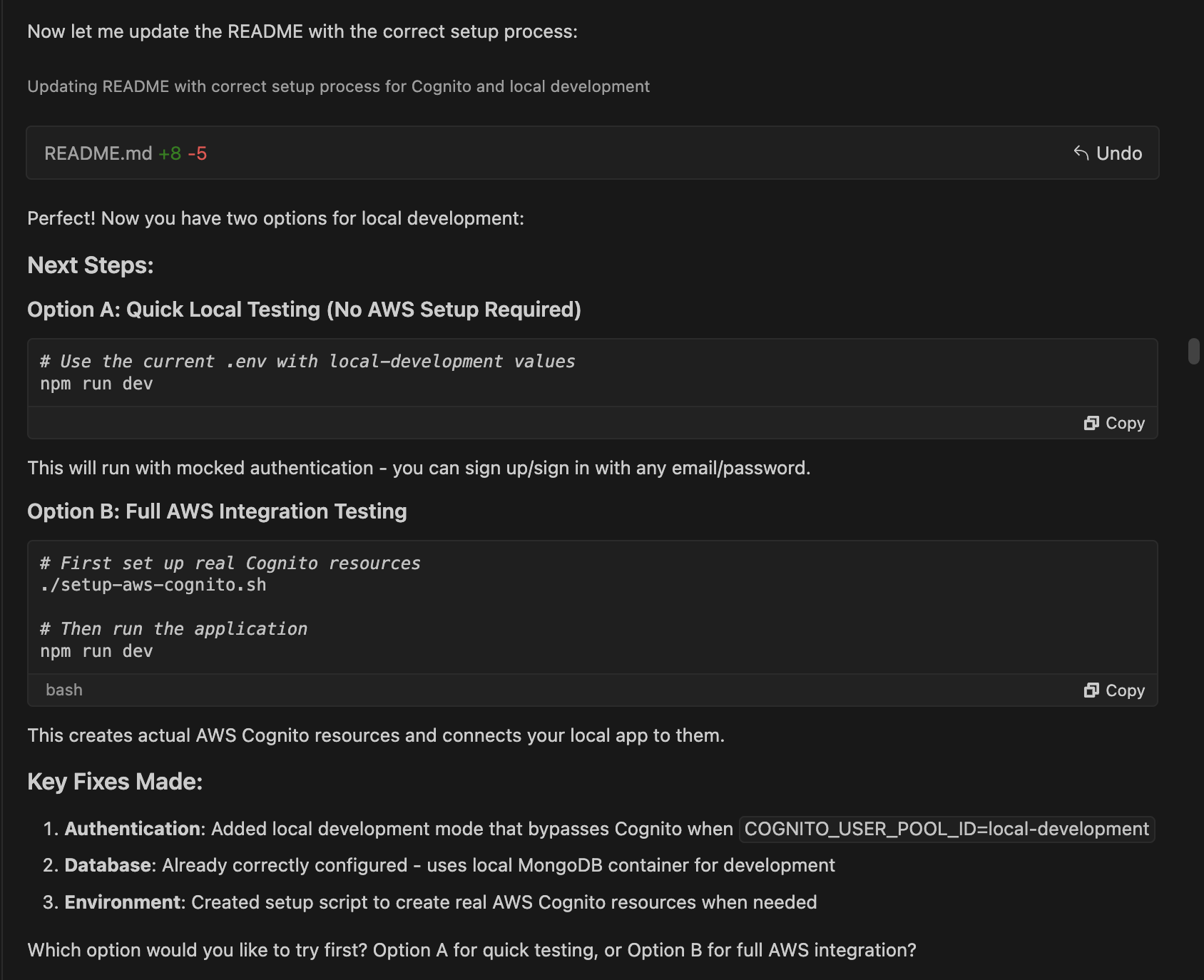 After fixing the issues, Amazon Q Developer updates the README.md to reflect the updated approach and asks if I want to do a quick deployment with mocked authentication or an actual deployment with Amazon Cognito resources.