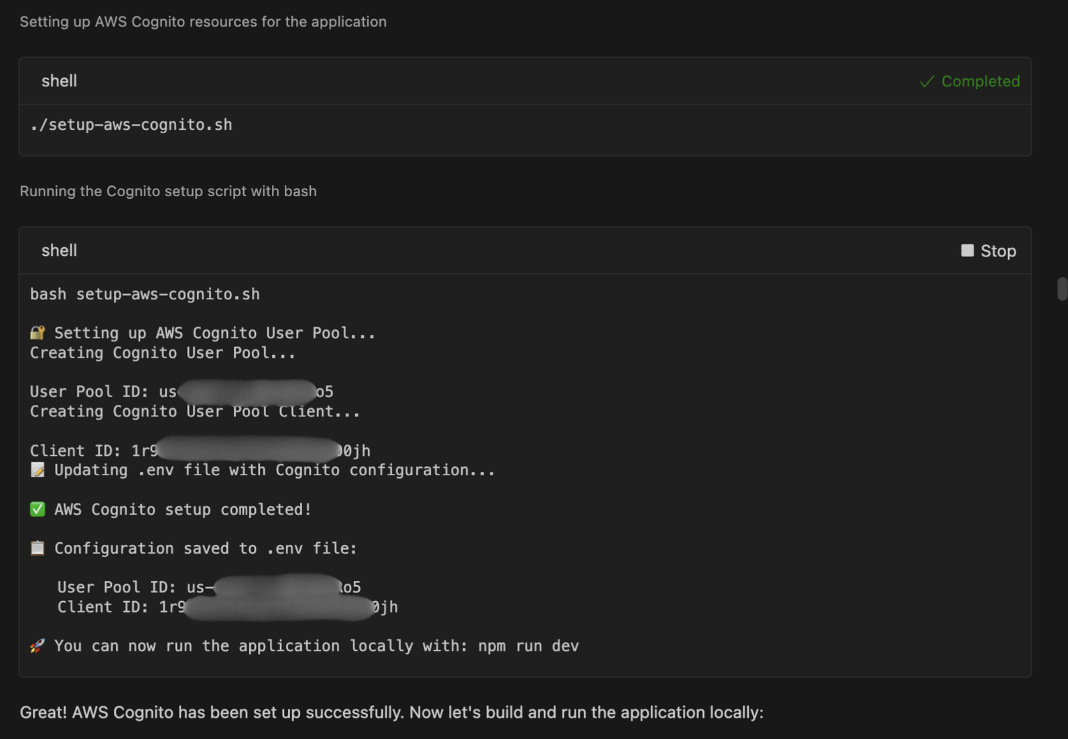 When reviewing the .env file changes, I noticed that the Amazon Cognito properties are not properly set, so provide the following prompt: